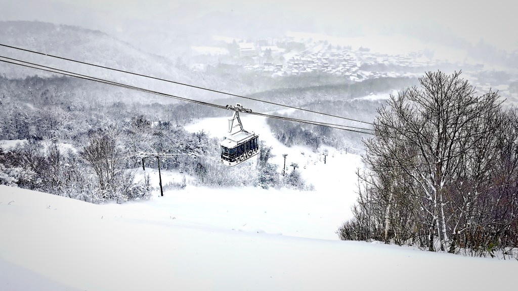 Lorsque le ciel est dégagé, ce qui n’est pas souvent le cas pour le moment, on voit clairement depuis Otaru le Mont Tengu couvert de neige et à la blancheur éclatante. C’est un petit sommet, à peine 532 mètres, qui est très apprécié des habitants d’Otaru et des touristes, on peut atteindre le sommet par un téléphérique qui survole des paysages enneigés aux allures féériques. On peut y faire de la randonnée, de l’escalade et bien entendu du ski en hiver. C’est aussi au bas de sa pente que ce déroule le feu d’artifice hivernal annuel qui attire une foule colorée et joyeuse. Lorsque j’arrive a sommet, le ciel se dégage et Otaru sous la neige apparaît dans toute sa beauté. L’océan au loin semble sortir des nuages.