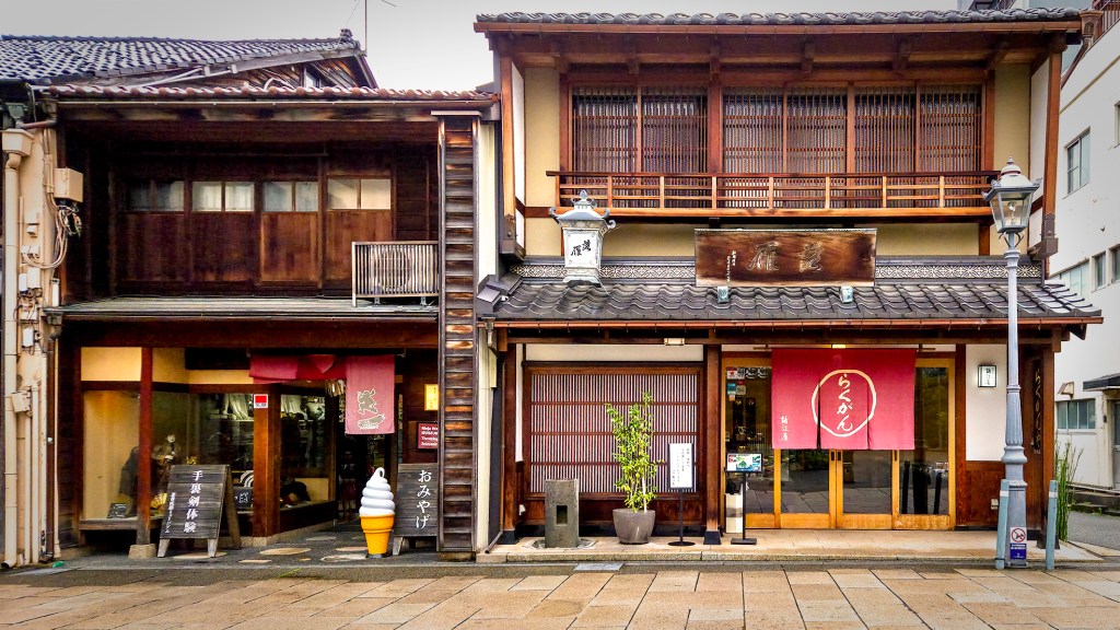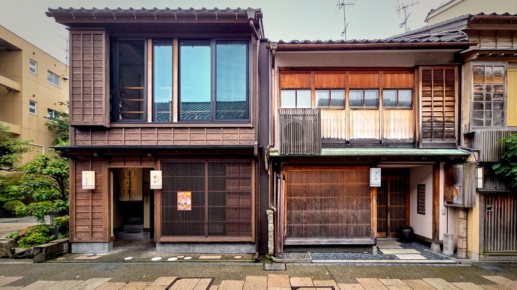 Le Kazuemachi chaya par contre, sur la rive gauche de l’Asano, est fait de maisons en bois sans vitrines tapageuses ou publicités extérieures. Certaines sont habitées, d’autres sont des Izakayas, des cafés ou des bars où il est très difficile d’être reçu sans être accompagné d’amis japonais et surtout sans parler japonais. Mais dans certaines maisons on peut boire un café ou un thé en dégustant quelques pâtisseries sucrées pour autant qu’on réussisse à trouver un endroit qui dit ce qu’il est. Généralement, il n’y a qu’un nom en japonais sur l’enseigne.