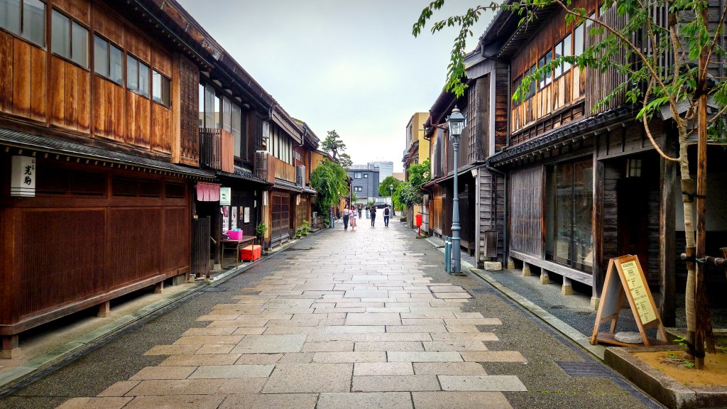 J’ai débuté ma déambulation heureuse et parfois émue le jour de mon arrivée, commençant par le quartier de Nishi chaya, ancien quartier de geishas qui longe le jardin Kenrokuen au sud et dans lequel il reste de nombreuses maisons en bois superbes datant de l’époque Meiji ou même Edo. Mystérieusement, on n’y croise quasiment jamais de touristes, même lorsqu’il fait beau, à l’exception de la maison de DT Suzuki, toute en pierre et en béton, devenue un musée qui attire parfois quelques curieux occidentaux du bouddhisme zen. Je m’y arrête un moment, il est trop tard pour y rentrer, mais l’architecture du lieu, l’ondoiement de sa pièce d’eau inspirent une petite halte respectueuse un peu mystique.