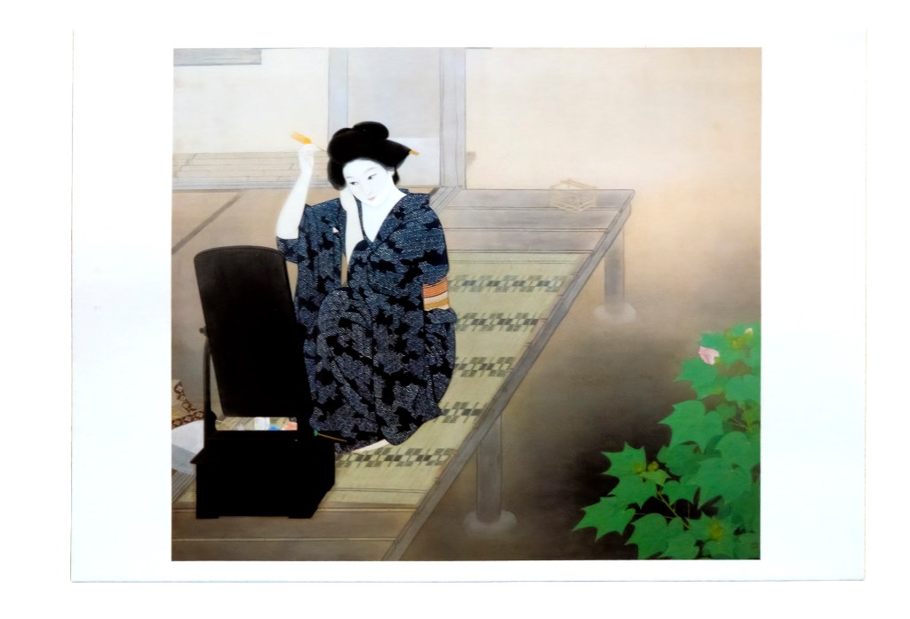 Une femme agenouillée sur la terrasse en bois d’une maison japonaise, fixe sa coiffure avec des 笄. Vêtue d’un kimono, elle fait face à un miroir. Au-dessous d’elle on devine l’eau d’une mare dans un jardin japonais traditionnel. Derrière elle, une 虫籠, amenée à contenir peut-être une cigale ou une luciole, laisse supposer qu’elle s’apprête à sortir. La toile est d’une grâce inouïe, l’élégance du geste vient harmonieusement équilibrer l’avant-plan de feuillage qui donne à la scène sa profondeur de champ.
